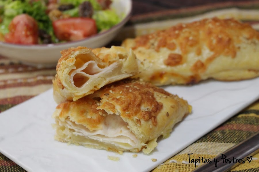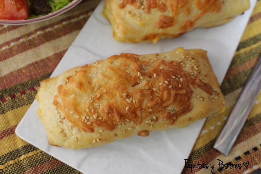 Extendemos el hojaldre sobre una hoja de papel vegetal. Cortamos dos porciones cuadradas, colocamos encima las lonchas de pechuga de pavo y de queso y cerramos haciendo como una especie de triptico. Pintamos con huevo batido y espolvoreamos queso rallado y sésamo por encima. horneamos unos 20 minutos a 180º, hasta que estén doradas.