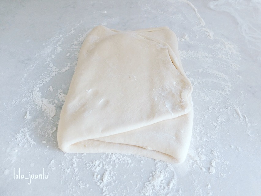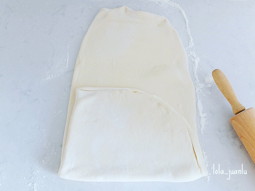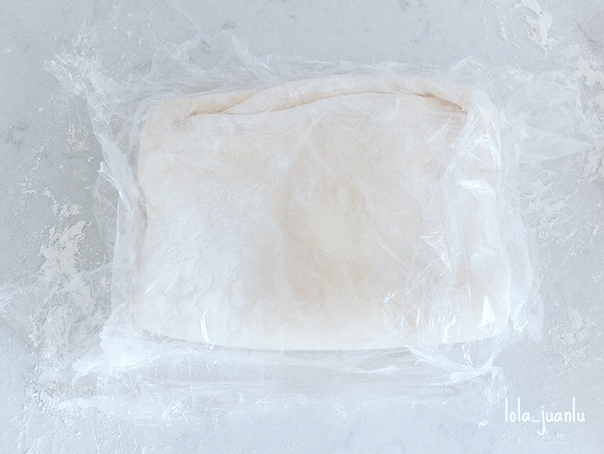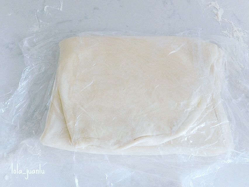 Es decir, una vez que tenemos la masa estirada, la doblamos, llevando un extremo hacia el centro y el otro extremo hacia el final, de manera que cubra la parte de masa anterior. Tapamos con film y dejamos reposar durante 15 minutos.