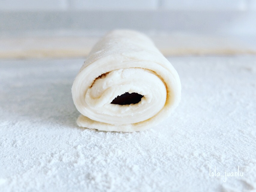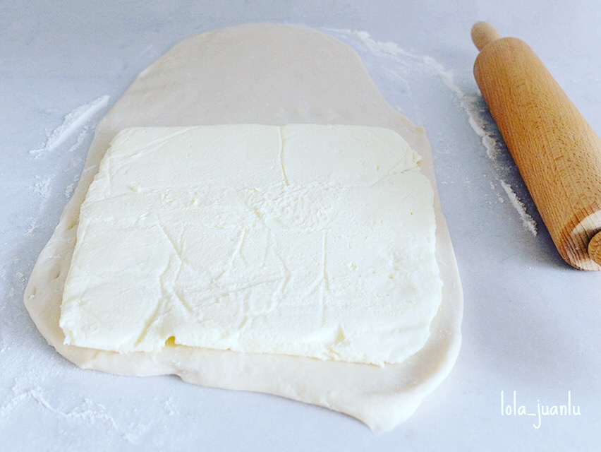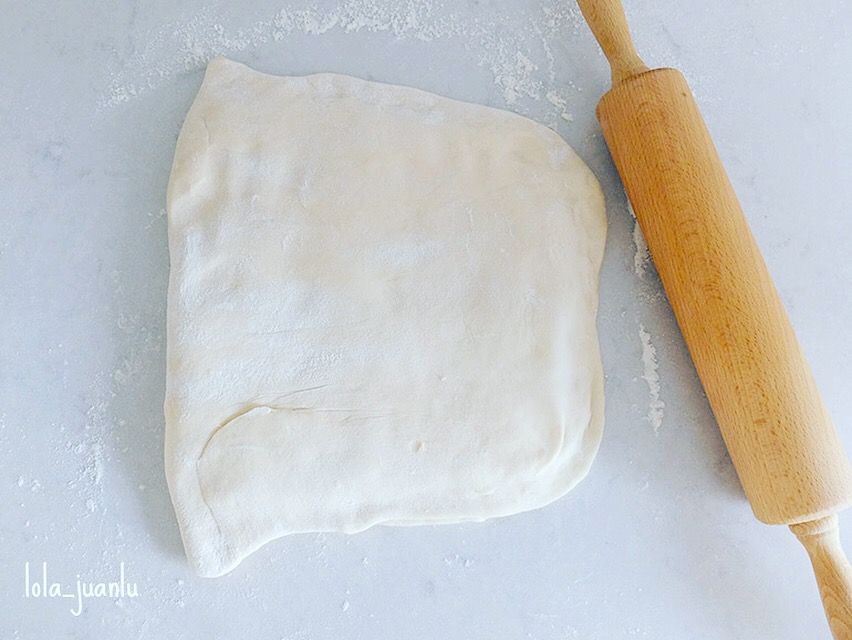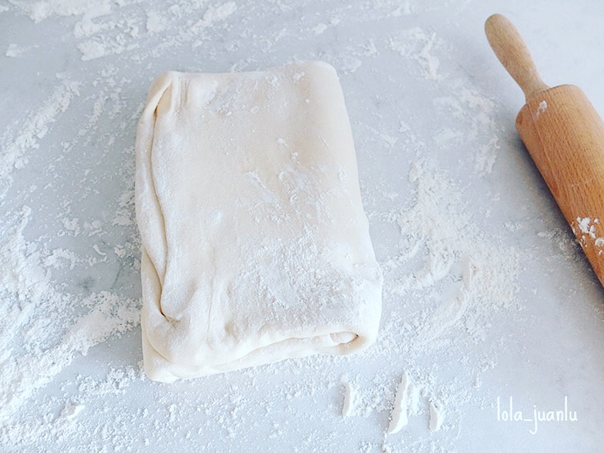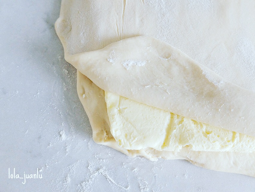 Colocamos la mantequilla en un lateral y cerramos la masa en forma de libro, quedando la mantequilla totalmente cubierta por la masa. Humedecemos la masa un poco donde se juntan las dos capas de ésta para que se pegue bien.