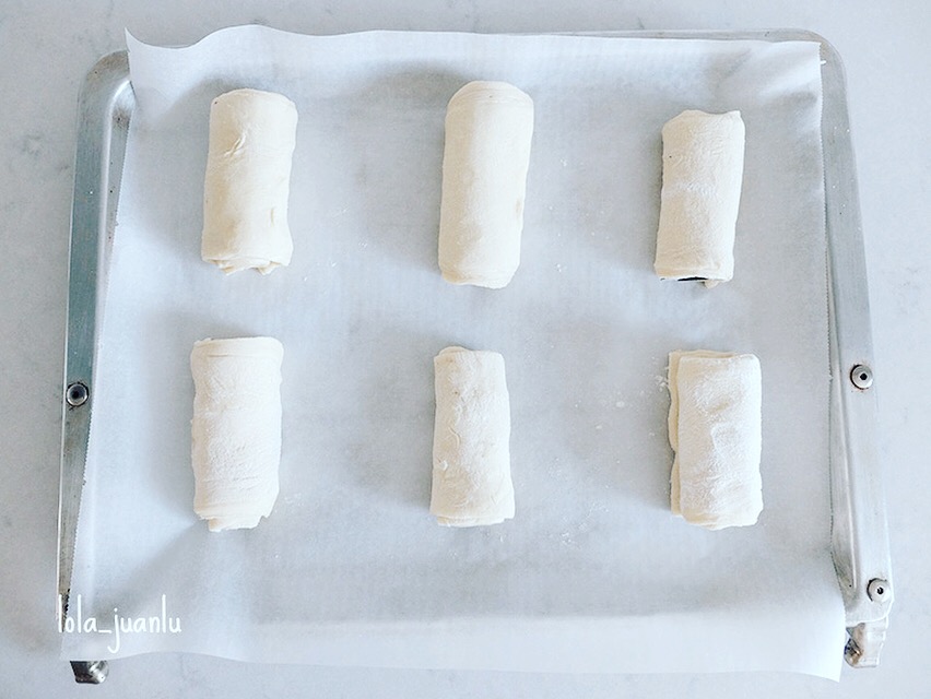 Enrollamos cada barrita de chocolate en un rectángulo de masa y lo colocamos en una bandeja de horno. Tapamos con papel film y dejamos fermentar hasta que dupliquen su tamaño.