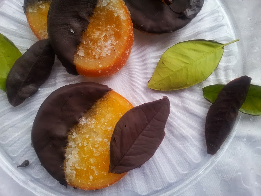 Para hacer las hojas de chocolate simplemente he cogido hojas de mi pequeño naranja y he introducido la parte que tiene el nervio más claramente definido, es decir el revés de la hoja, y lo he metido, con los dedos sin miedo, en el chocolate. He dejado que escurriera como con las naranjas y he dejado endurecer en la rejilla. Veréis cómo poco a poco el chocolate va perdiedo el brillo, son sólo unos minutos quedaros a verlo. Cuando tocando el chocolate veo que ya no me mancho, simplemente cojo un pequeño punto y tiro cuidadosamente hacia atrás. La hoja sale entera, es maravilloso. Como veis en las fotos la parte que brilla es la que estaba en contacto con la hoja, la otra queda más opaca, como en los bombones.