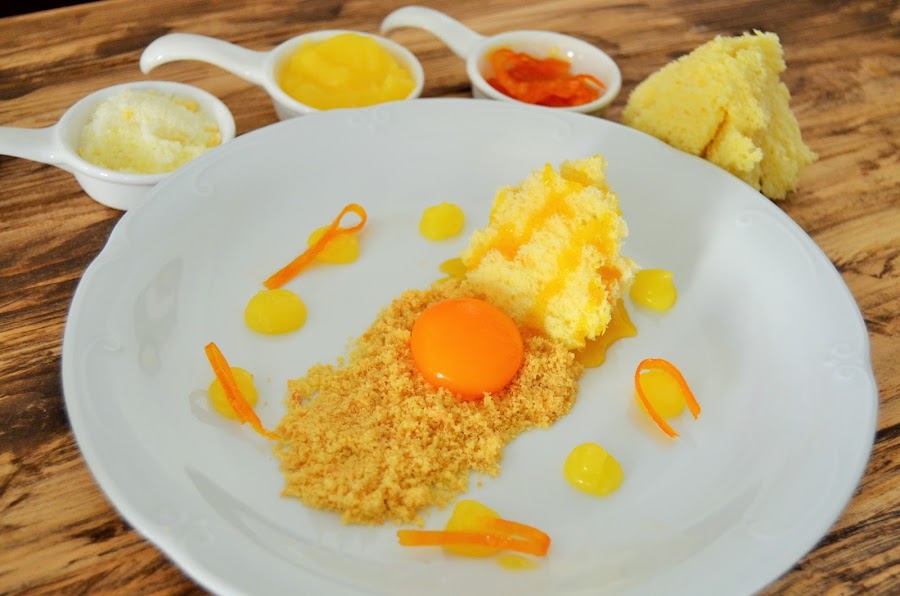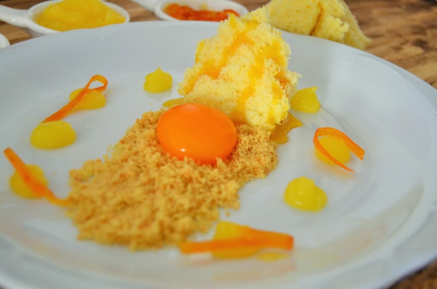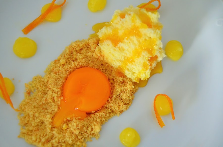 Solo queda montar, ponemos un trozo de la esponja de el bizcocho, cortarlo con las manos, ya que no queremos un corte perfecto. Ponemos unos trozos de struesel en un mortero y lo hacemos de una textura a la arena, y esta la colocamos al lado del bizcocho. Con mucho cuidado quitamos el azúcar a las yemas las colocamos de una en una encima de una espumadera y lo pasamos debajo de el grifo con un hilo de agua para que no se rompan, para quitarles todo el azúcar, secamos un poco y las ponemos encima del streusel. Ponemos la crema de naranja en un biberón y vamos poniendo unos puntos alrededor, encima de los puntos ponemos unas tiras de las cascaras de naranjas caramelizadas y bañamos la esponja del bizcocho con un poco del caramelo de naranja.