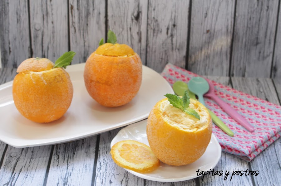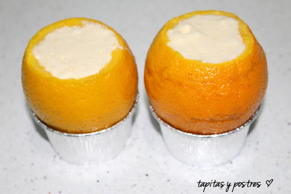 Y con esa crema rellenamos nuestras naranjas. Para que no se os vuelquen las colocamos sobre unos moldes de magdalenas de aluminio. Al congelador unas horas.