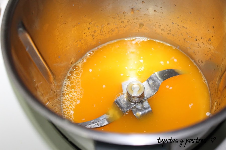 Mezclamos el zumo de las naranjas (aproximadamente unos 250 gr) colado para que no tenga nada de pulpa con la leche condensada, 20 segundos a velocidad 4.
