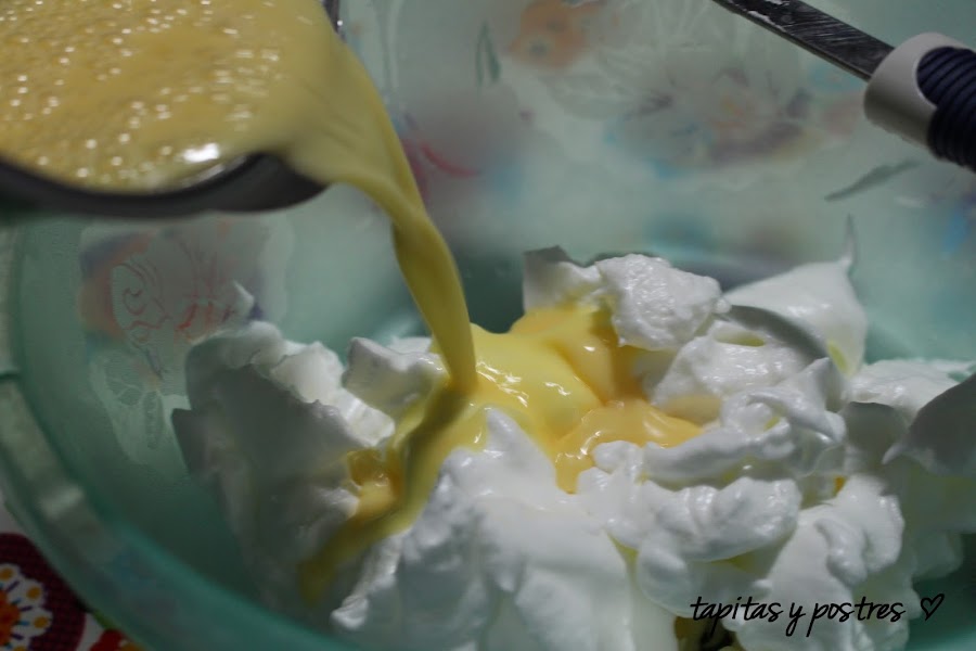 Ahora con mucho cuidado y con movimientos envolventes mezclamos las claras montadas con el zumo de las naranjas y la leche condensada.
