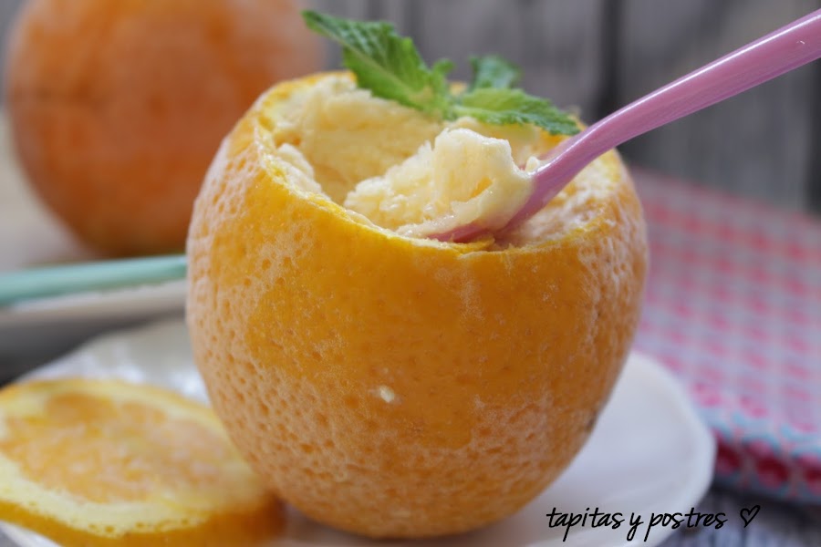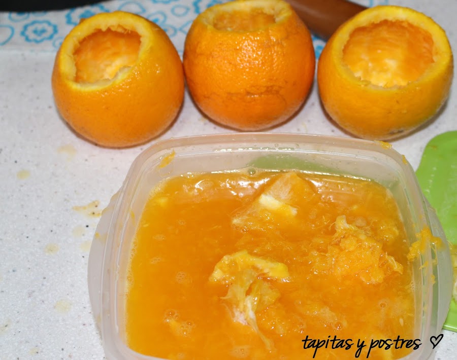 Vertemos la crema sobre las naranjas y las llevamos al congelador.