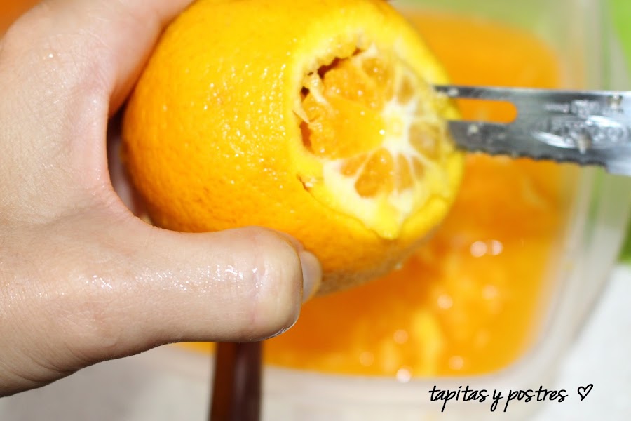 Lavamos las naranjas y las secamos bien. Le cortamos el casquete superior y con un cuchillo afilado cortamos la pulpa. Seguimos vaciándola con una cuchara y reservamos todo el zumo en un bol. Hacemos lo mismo con las otras naranjas.