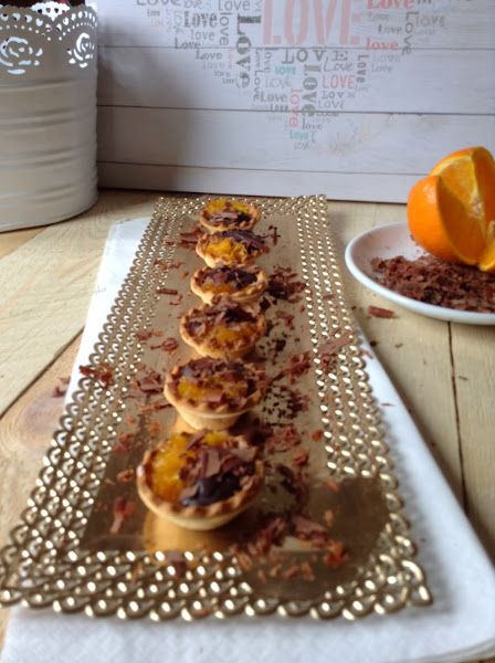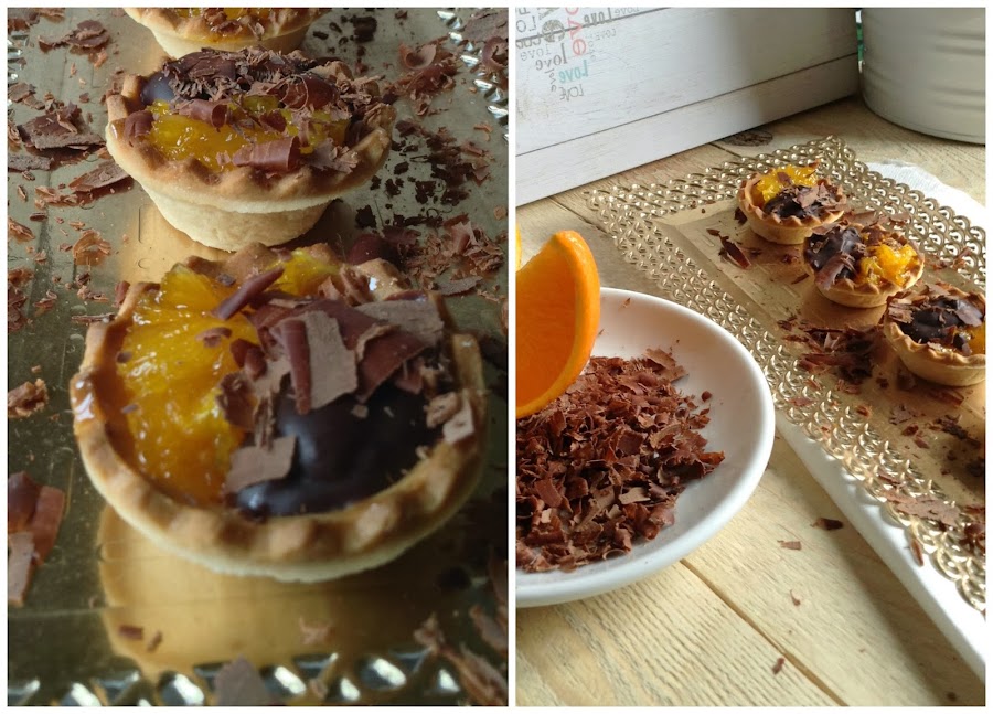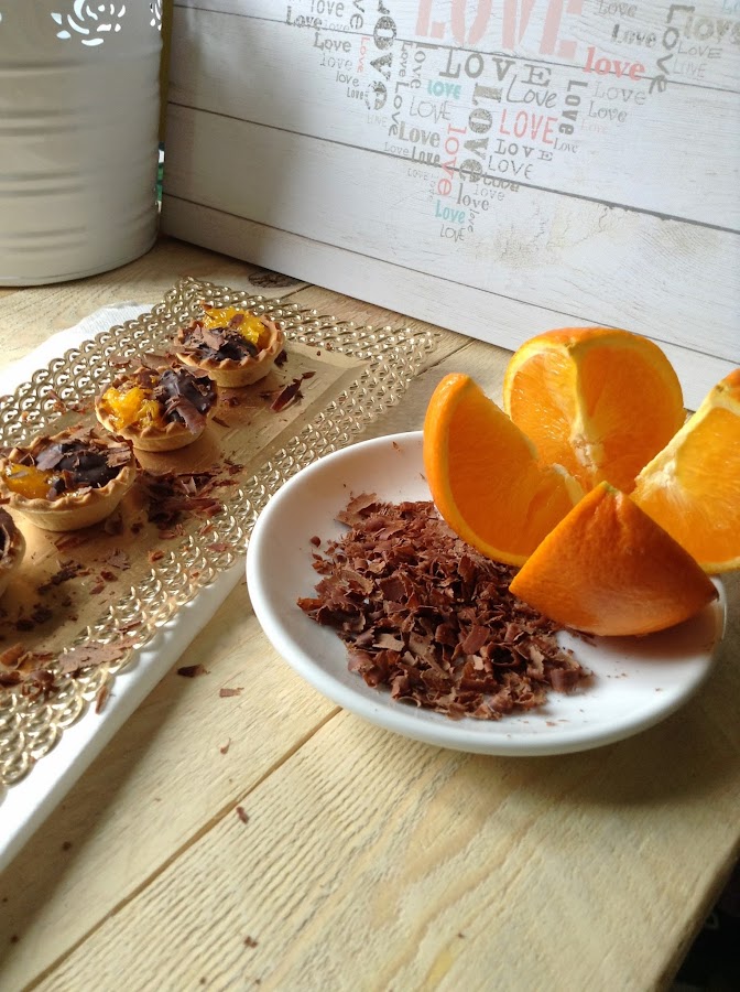 Rellenar una a una las tartaletas con los gajos de naranja primero y con en chocolate en segundo lugar