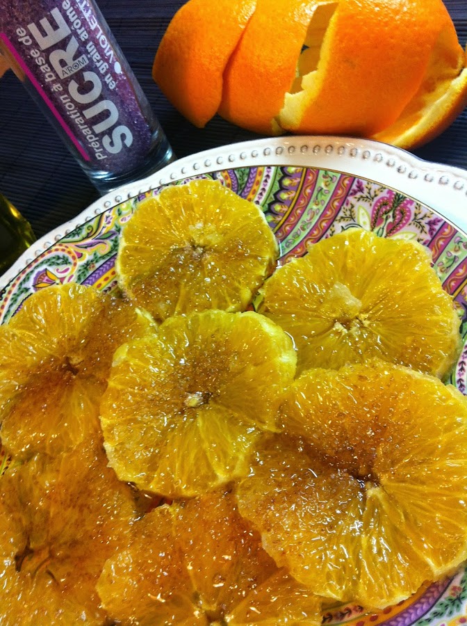 azúcar moreno (yo usé un azúcar de violetas que tenía y aparece en la foto)Se pelan las naranjas y se retira la piel blanca cercana a la cáscara. Se cortan en rodajas medianas.