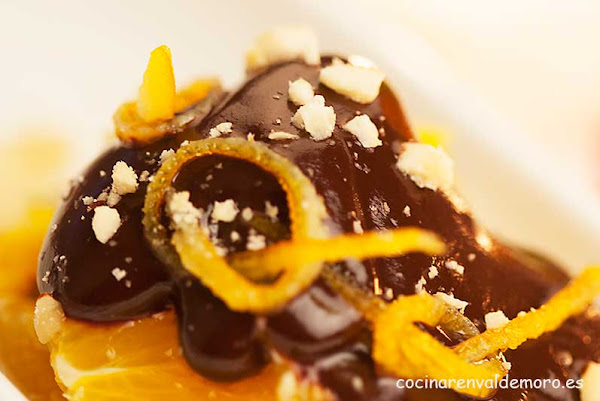 Para emplatar retiramos el film de los platos, regamos la cobertura de chocolate caliente y distribuimos las serpentinas de naranja. Hemos utilizado frutos secos medio machacados para adornar y añadir un punto crunch ;). ¡Disfrutadlas en compañía!