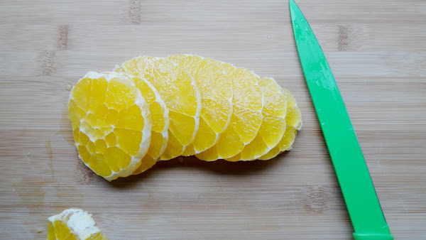 Lo primero que haremos será pelar y cortar la naranja, lo podéis hacer a rodajas, a trocitos o como más os guste. Yo la he cortado en rodajas y después he hecho algunos trocitos más pequeños para que fuera más fácil de hacer y de comer :)
