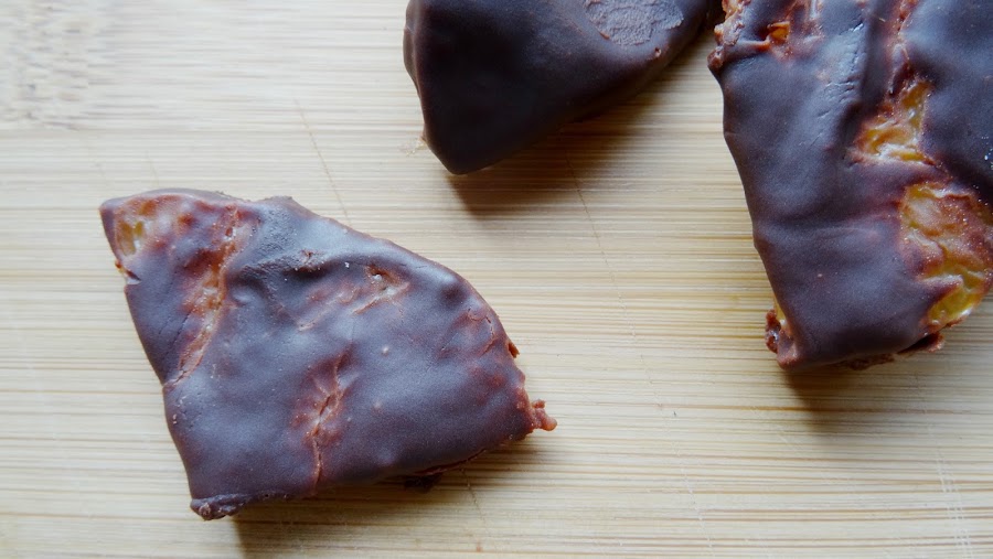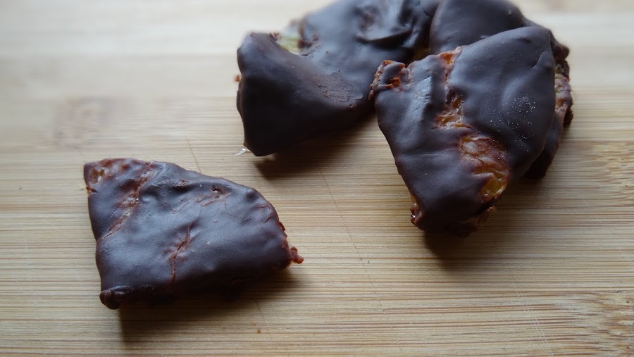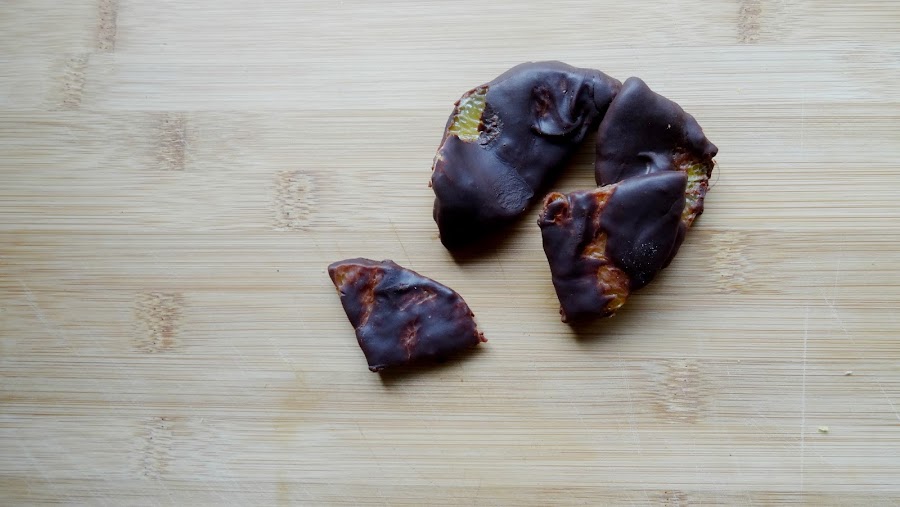 Al ser la naranja natural, cuando la muerdes sigue teniendo la textura de una naranja normal y encima se junta el zumo que suelta con el chocolate, vamos que me encantaron!