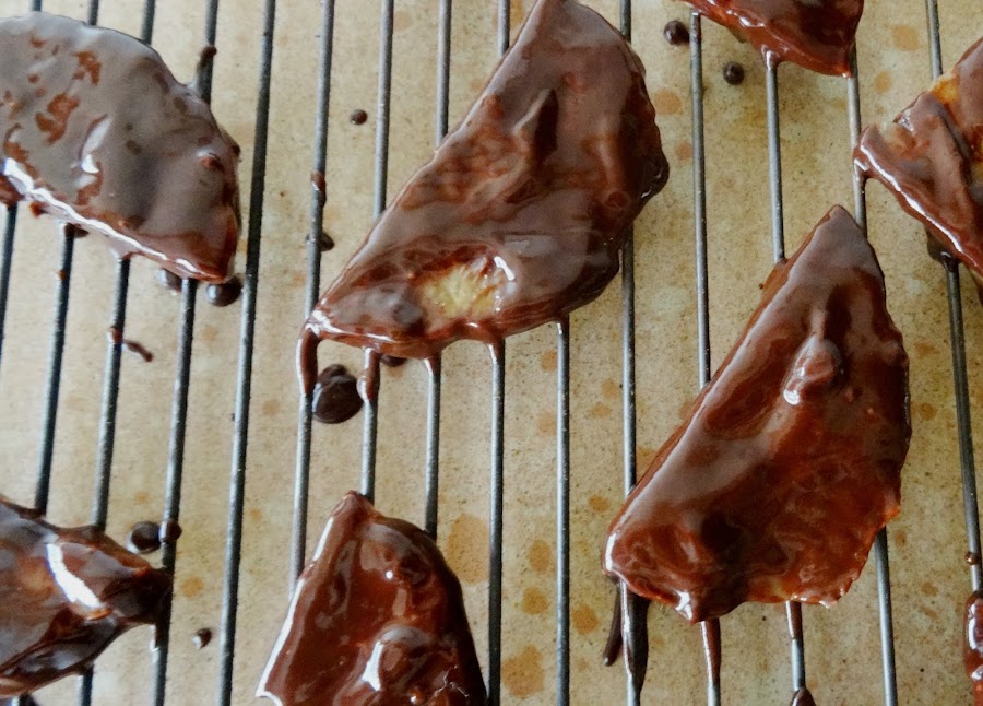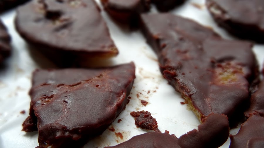 Una vez se hayan enfriado, pasamos los trocitos a un papel vegetal y lo ponemos en la nevera para que se acabe de endurecer el chocolate y listo! Tenemos un postre o una merienda la mar de buena!