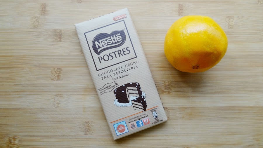 Para hacerla, tan solo necesitaréis una naranja o un par, depende de la cantidad que queráis hacer y chocolate negro para fundir. Yo he utilizado este de Nestle que teníamos en casa, pero podéis utilizar el que queráis. También usaremos un poco de mantequilla o margarina para fundir el chocolate.