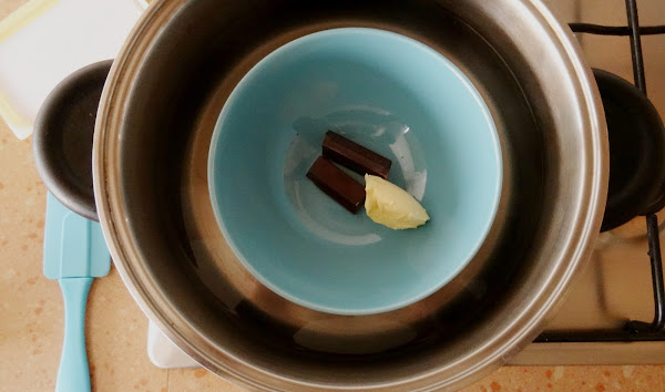 Reservamos los trozos de naranja y ponemos el chocolate al baño maría con un poco de mantequilla. Para que os hagáis una idea, para una naranja he usado casi media tableta y aún me ha sobrado un poco.