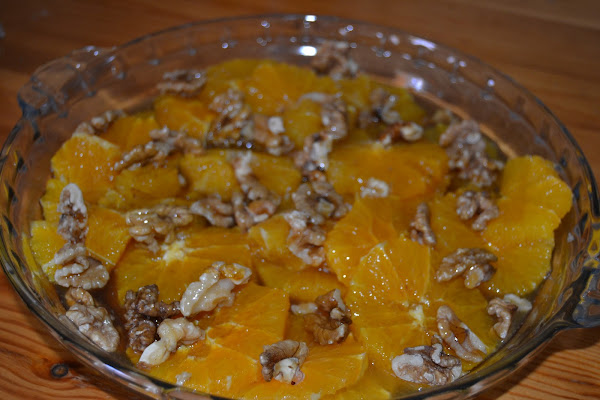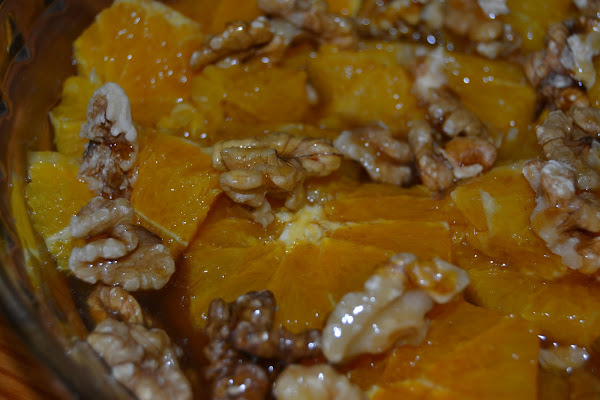 Las ponemos en una fuente con el zumo sobrante y le añadimos por encima las nueces y la salsa de vino y miel. Dejamos reposar una media hora o mas para que las naranjas se impregnen con la salsa y lista para comerlas. Aunque a mi me gusta comerlo calentito, le doy un golpe de horno o microondas y estan deliciosas. Espero que os guste.