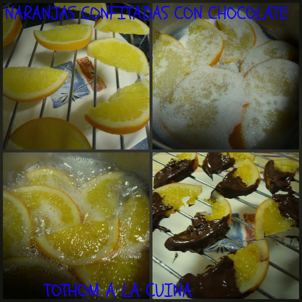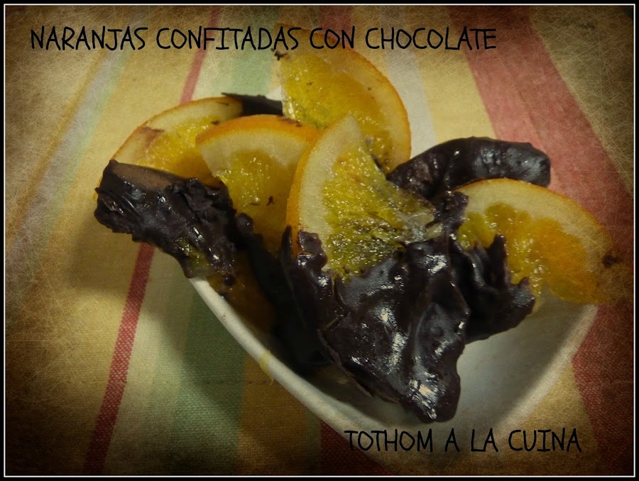 La receta que propongo son unas rodajitas de naranjas confitadas y cubiertas de chocolate. Ummmmm deliciosas y muy facilitas, ideales para acompañar el cafecito de media tarde, un té o una infusión.