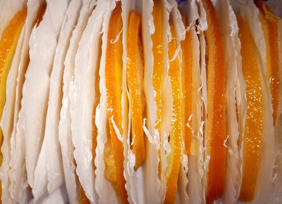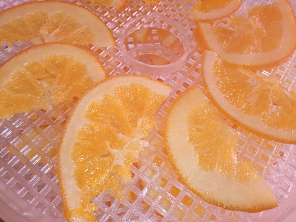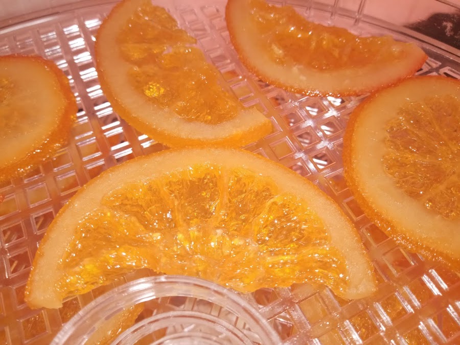 Disponemos las rodajas de naranja en las bandejas de la deshidratadora, dejando algunos huecos para que circule bien el aire.