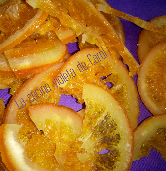 En una olla colocamos el azúcar y el agua, mezclamos y llevamos al fuego, cuando se haya disuelto el azúcar, metemos las rodajas de naranja.
