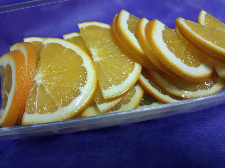 Cortamos las naranjas por la mitad, de arriba a abajo, y estas mitades las cortamos en rodajas finas, podemos usar una mandolina o un cuchillo bien afilado, en mi caso han sido con cuchillo (con la mandolina perdía zumo al cortarla)