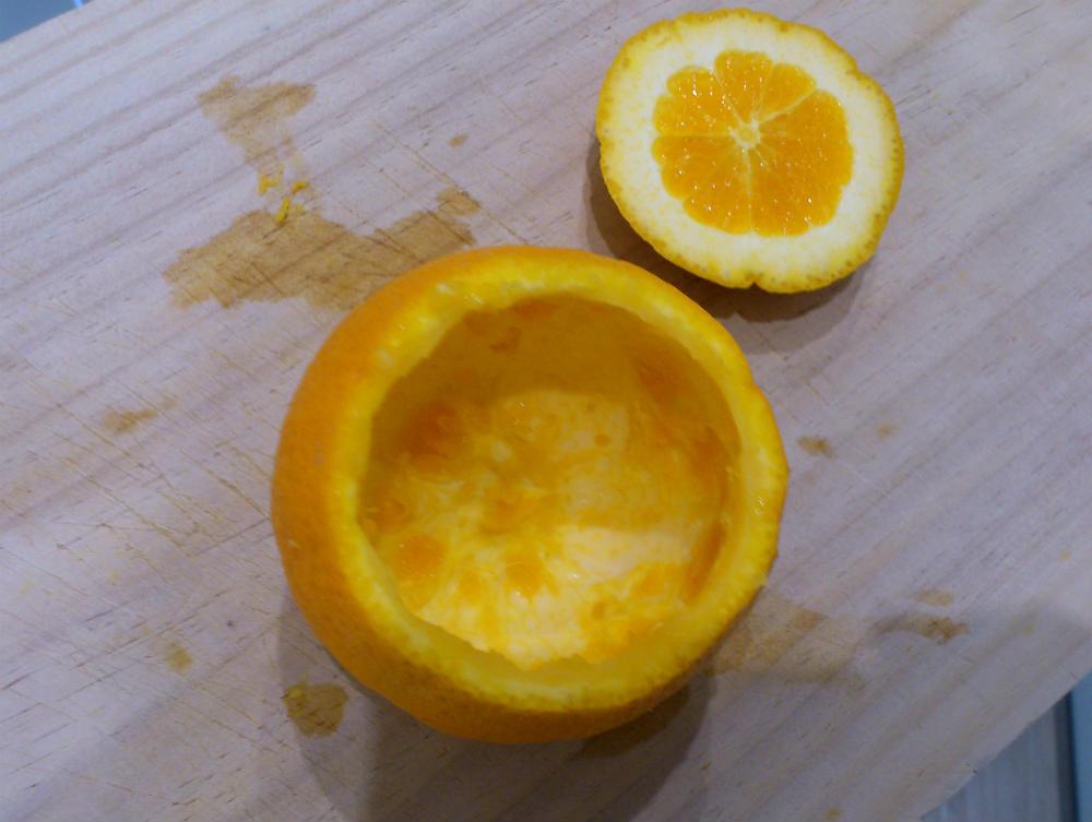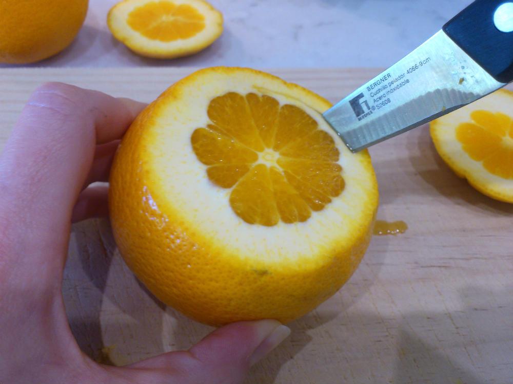 3. Después, como veis en la siguiente foto, se corta con cuidado la parte superior del interior de la naranja y lo retiramos con la ayuda de una cuchara. A continuación, con la misma cuchara iremos vaciandola. Es como pelar la naranja pero al revés: si pillas el pellejito externo de los gajos saldrá muy fácilmente, de todas formas, con paciencia y cuidado para que no se rompa, se vacía fácilmente.