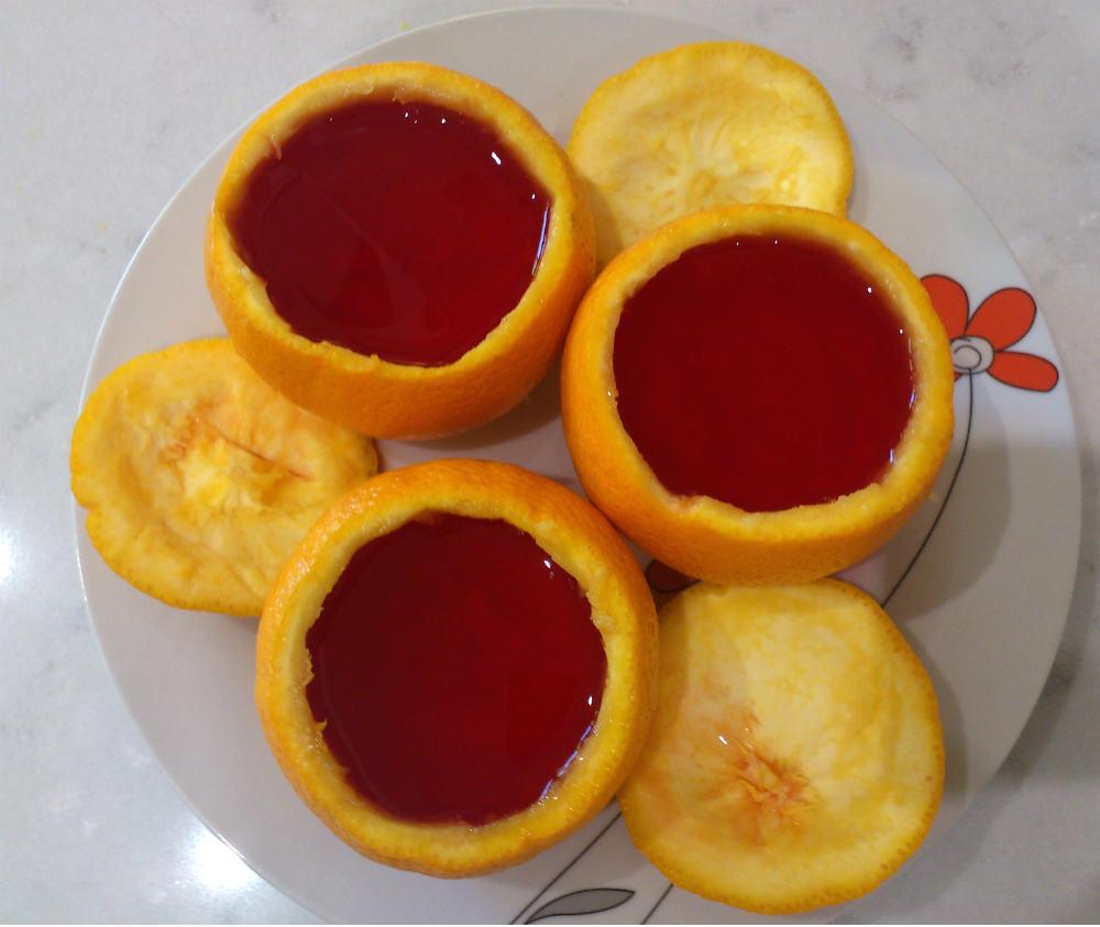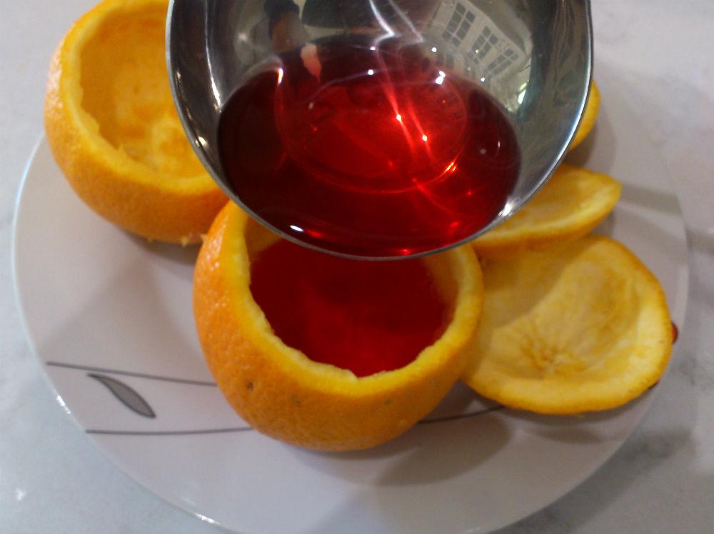 4. Como a estas alturas ya estará fría la gelatina, con un cucharón, rellenamos las naranjas.