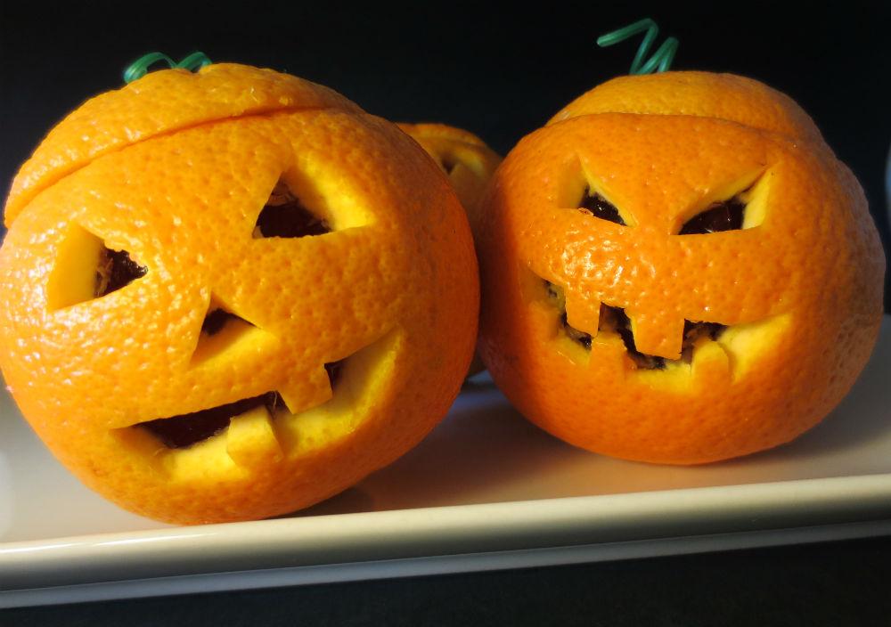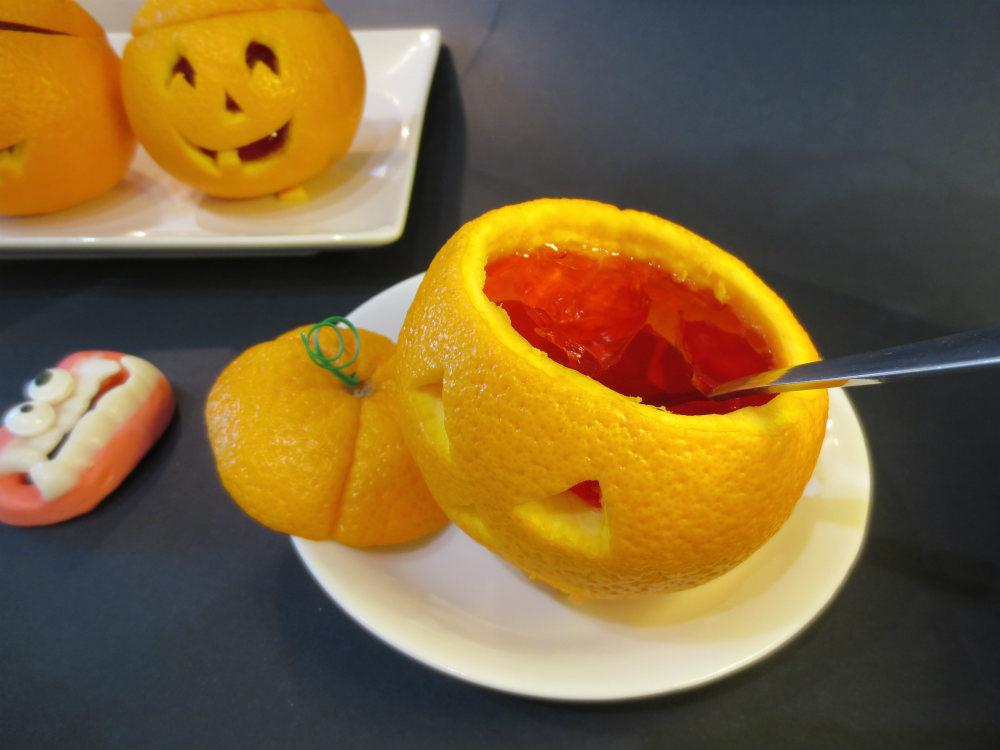 5. Una vez rellenas, las metemos con mucho cuidado en el frigorífico y las dejamos reposar durante unas horas (2 ó 3h.) hasta que cuaje. Trata de hacer las Naranjas Jack O´Lantern con suficiente antelación o el día de antes para que las tengas listas sin problemas.