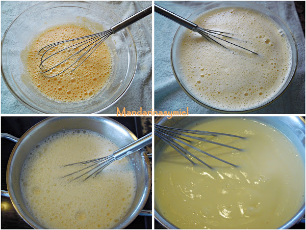 Pasa toda la mezcla a un cazo y ponlo a fuego lento hasta que empiece a espesar pero sin que llegue a hervir, remueve continuamente para que no se pegue en el fondo.