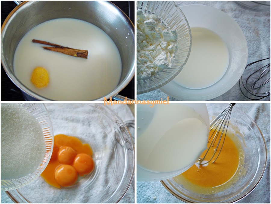 Reserva un poco de la leche y pon el resto a calentar con la corteza de limón y la rama de canela sin que llegue a hervir.