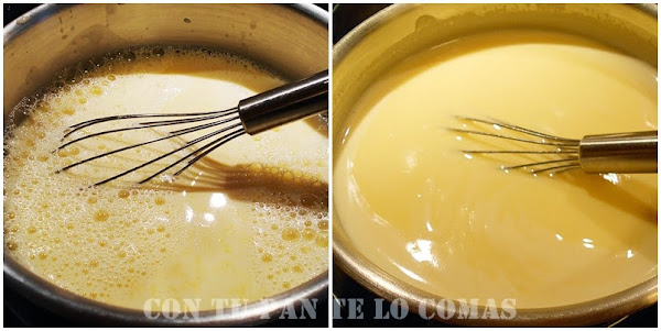 3. Volvemos a poner esta mezcla a fuego medio, sin parar de remover hasta que espese. Lo retiramos en seguida para que no se corten.