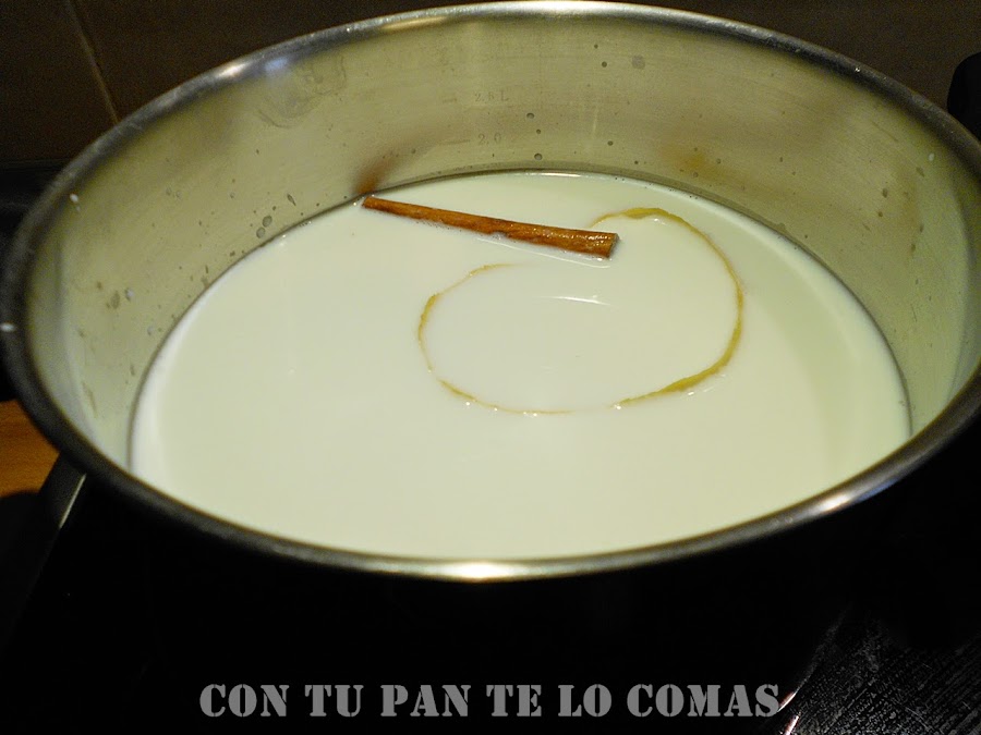 1. Empezamos poniendo a calentar la leche con el azúcar, la piel del limón y la rama de canela. Cuando hierva lo apagamos y lo dejamos templar.