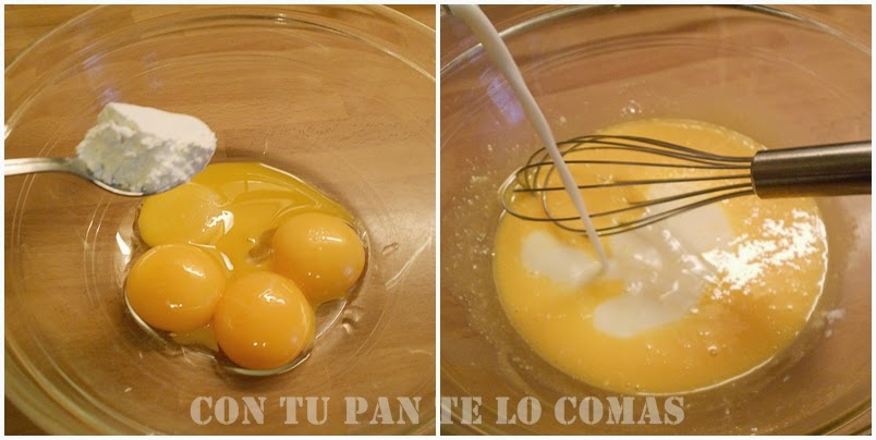 2. En un bol ponemos las yemas y las mezclamos con la cucharadita de maizena. Vamos añadiendo la leche (que habremos colado previamente) poco a poco hasta integrarla toda.