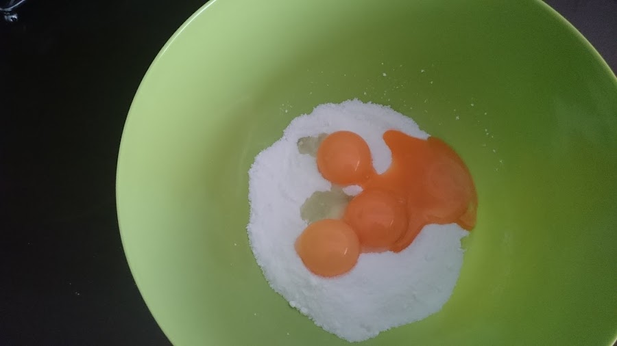 Ahora cogemos un bol, ponemos las dos clases de azucares y removemos para que se mezclen, a continuación ponemos la maicena y hacemos la misma operación que antes remover para que se mezcle bien, seguidamente cogemos los huevos y los cascamos separando la clara de las yemas, y vertemos las yemas en el cazo con el azúcar, la maicena y removemos con unas varillas para que se mezcle,
