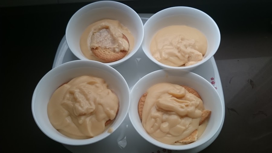 Ahora ya cogemos unos cuencos y colocamos una galleta en el fondo y vertemos un poquito de crema si queremos a mitad ponemos otra galleta y continuamos vertiendo un poco mas de crema hasta que cubra, eso ya lo dejo a vuestro gusto,recomiendo para su degustación poner un poquito de canela en polvo por encima quedara bonito en la presentación y rico para el paladar, espero que os gusten .