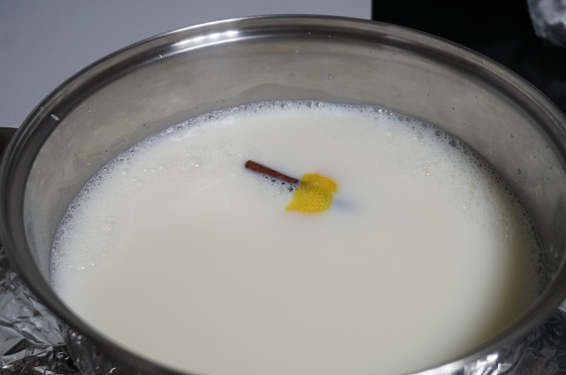 Pondremos en un cazo a calentar con la leche a fuego medio, la rama de canela y un trocito de cáscara de limón. Lo iremos removiendo poco apoco sin que llegue a hervir. Unos 5 minutos.