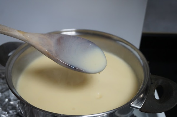 Sin subir el fuego del cazo de leche, iremos echando poco a poco la mezcla de las yemas e iremos removiendo sin parar y sin que llegue a hervir.