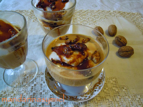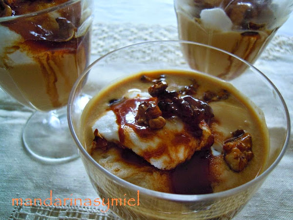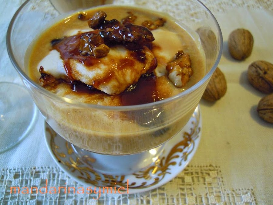 Coloca las natillas en los cuencos, copas o donde vayas a servirlas, pon encima las islas flotantes y adorna con las nueces y el caramelo.