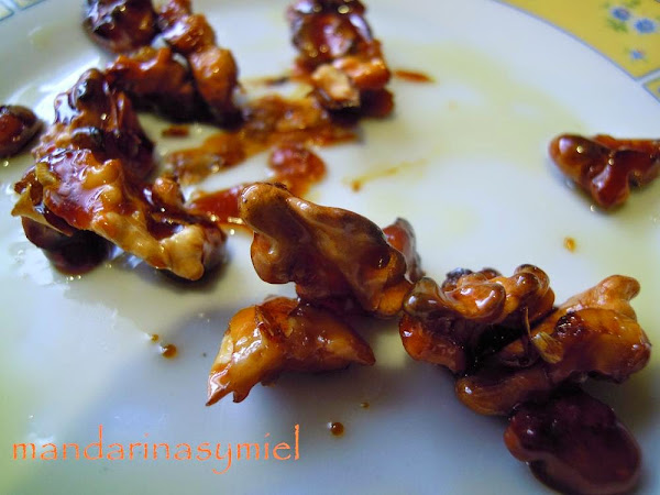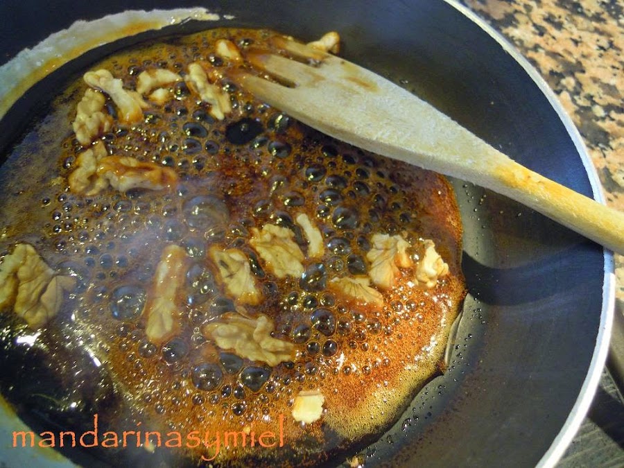 Cuando esté casi hecho el caramelo, añade las nueces peladas y troceadas, dales unas vueltas para que se caramelicen.