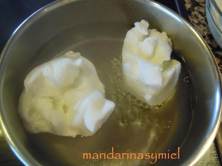 Pon un cazo con agua al fuego, cuando hierva, echa cucharadas de la clara montada, deja que se cuaje unos 3 o 4 minutos, escurre en papel absorbente.