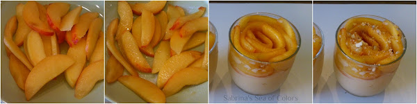 Llenamos los vasos o copas con la natilla o crema pastelera que puedes preparar el día anterior según esta receta, pues debe estar fría para decorar. Dejamos 1 dedo antes de llegar al final del vaso para luego poder acomodar el melocotón macerado. Iremos forrando toda la circunferencia del vaso desde afuera hacia adentro, superponiendo las láminas de melocotón para formar una bonita rosa. Para el centro, enrollamos una lámina de melocotón y la colocamos en el espacio que nos queda.