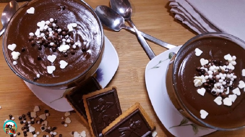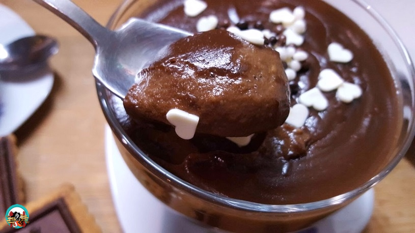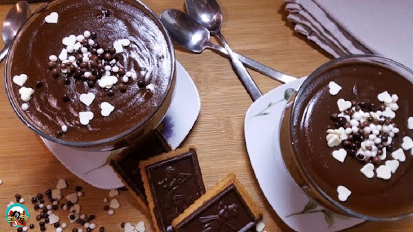Hoy tengo postre y de chocolate, unas rica natillas con chocolate y muchos corazones de chocolate.