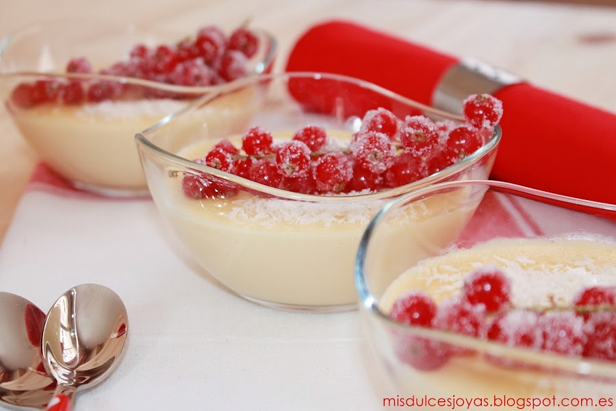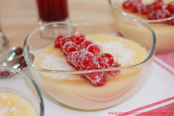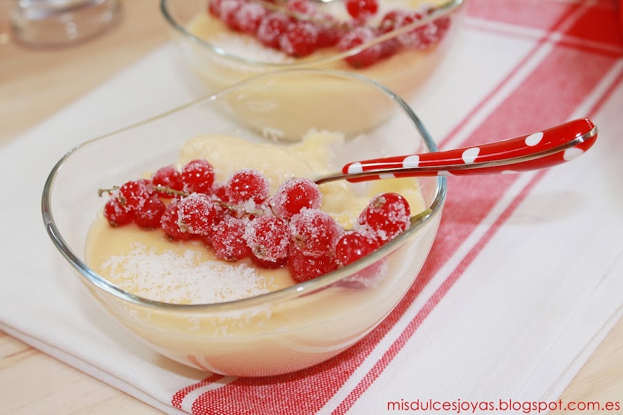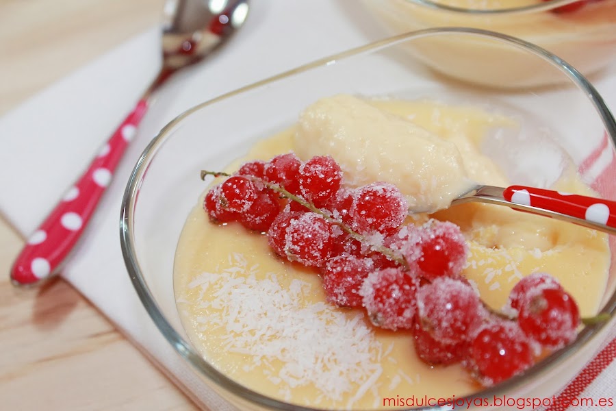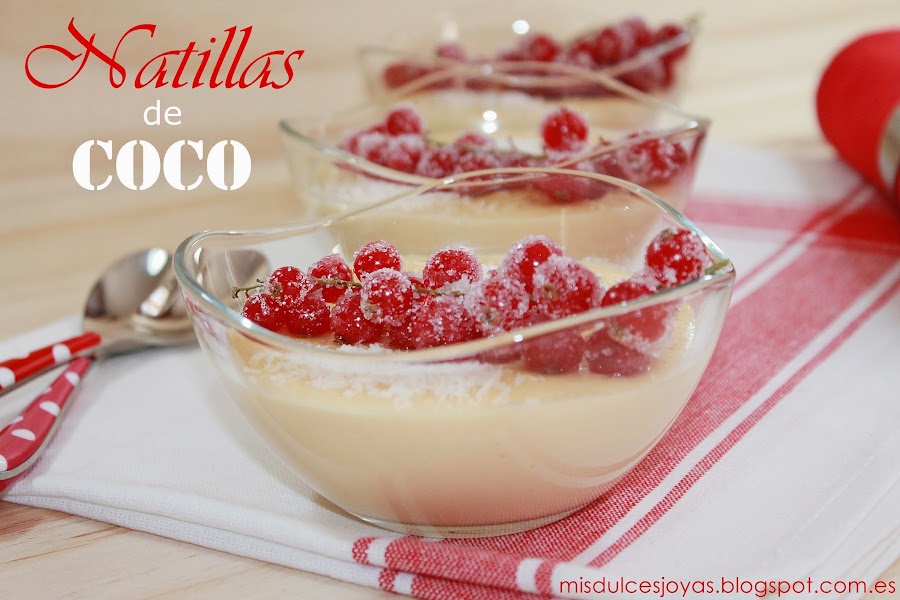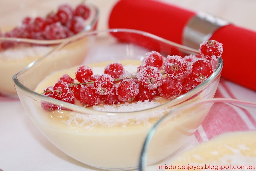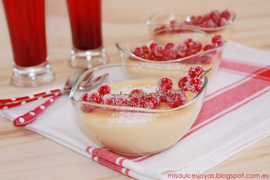 Que no os engañe el color rojo de las grosellas, ni el tono amarillento de las natillas, estas son unas verdaderas natillas de coco caseras, además a mí manera, y estoy segura de que os van a encantar.
