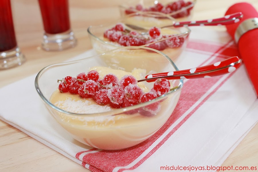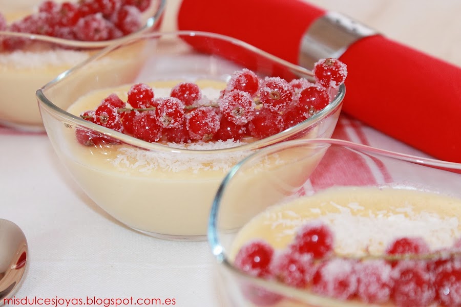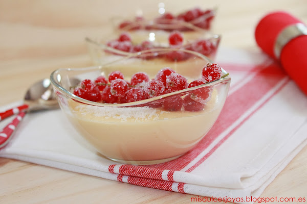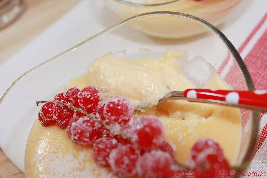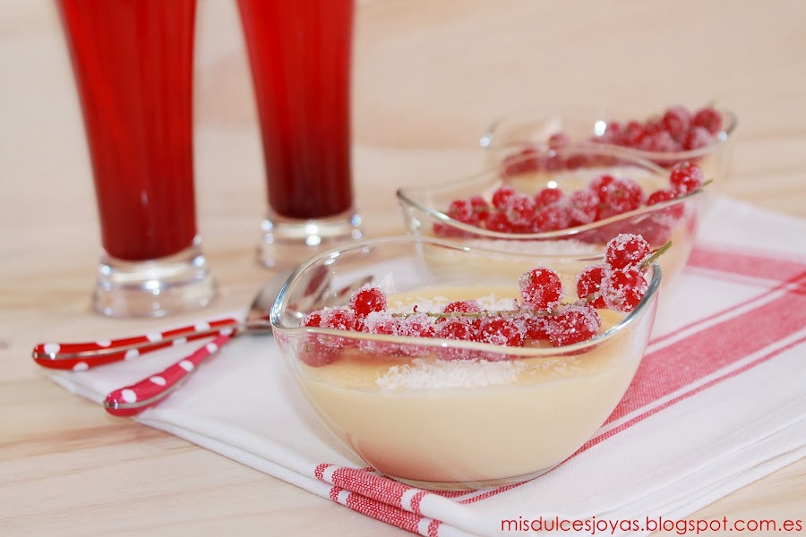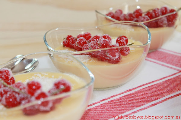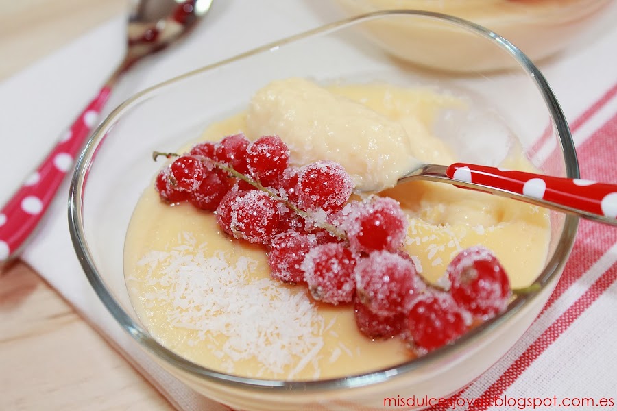 Que no os engañe el color rojo de las grosellas, ni el tono amarillento de las natillas, estas son unas verdaderas natillas de coco caseras, además a mí manera, y estoy segura de que os van a encantar.