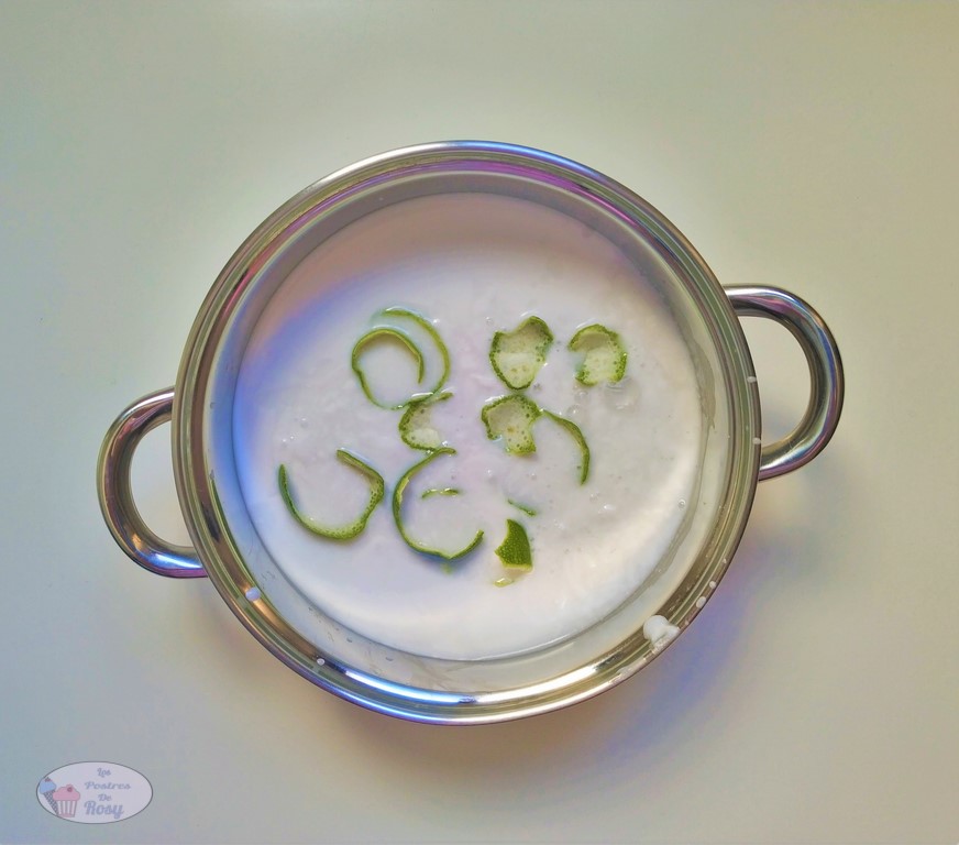 - En un cazo ponemos la mitad de la bebida de coco, la piel entera de dos limas, la esencia de vainilla.