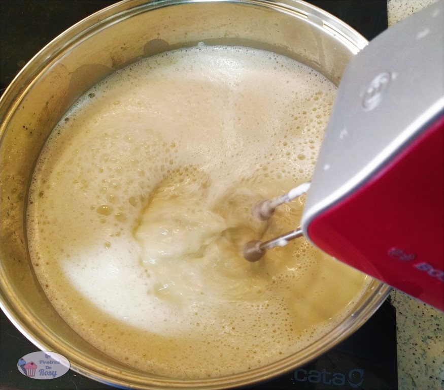 - Agregamos el almidón diluido al cazo con las yemas y llevamos al fuego, a temperatura media, hasta que se espese. ¡Ojo!, para evitar que se pegue al fondo y se queme, lo removeremos muy a menudo.