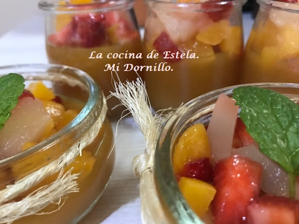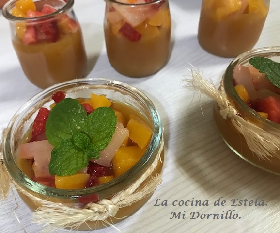 Las frutas yo se las puse mezcla fresca y en almíbar. Los zumos puedes cambiarlos a tu gusto y siempre mejor que sean zumos frescos.