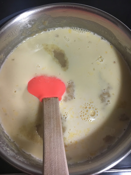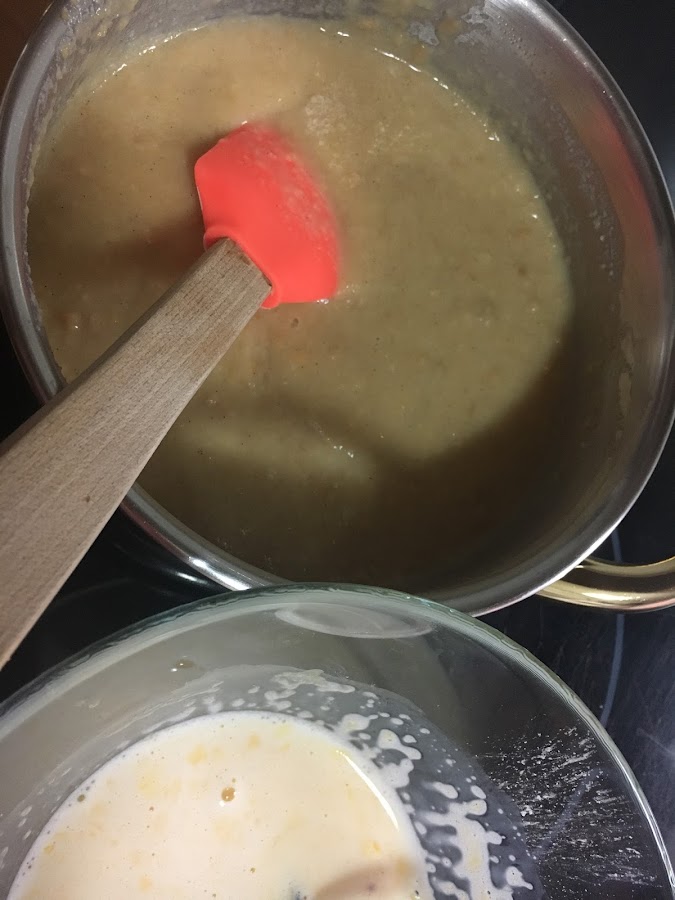 Cuando estén bien incorporadas a la leche, y siempre fuera del fuego, añadimos las yemas con la maizena: