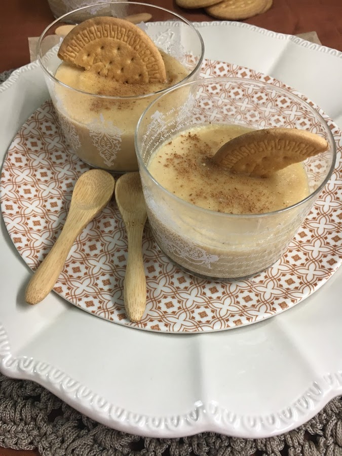 Se retiran del fuego. Se vuelcan en cacitos o en vasitos individuales y se espolvorean con canela molida. Se pueden decorar con galletas en trozos, o una galleta entera, o media en vertical como yo he puesto.