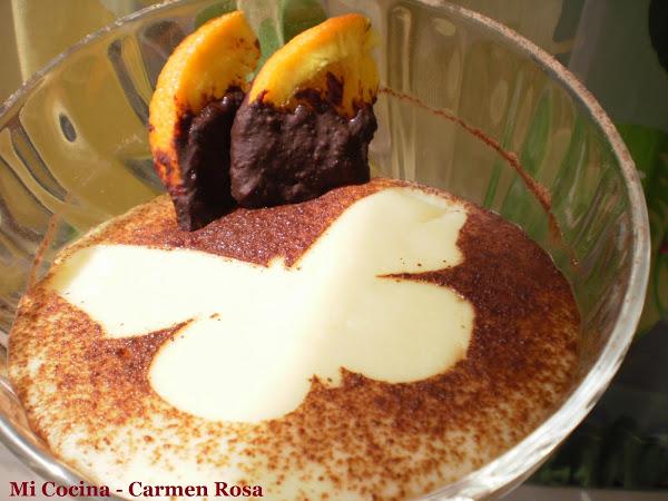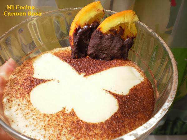 Medio litro de leche, el zumo de dos naranjas, cuatro huevos medianos, una cucharada sopera de maicena, la corteza de una de las naranjas (sin nada de blanco), un palo de canela, cinco cucharadas de azúcar, cacao en polvo para espolvorear (ella usó canela en polvo), dos o tres trozos de naranja por comensal y cuatro pastillas de chocolate especial postres.