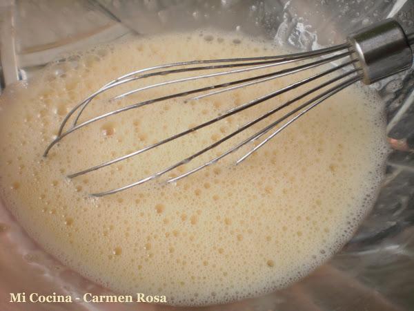 En un cuenco batir los huevos con el azúcar, agregar la maicena y el zumo de naranja (pasado por un colador a fin de que no caigan trozos de pulpa ni semillas).